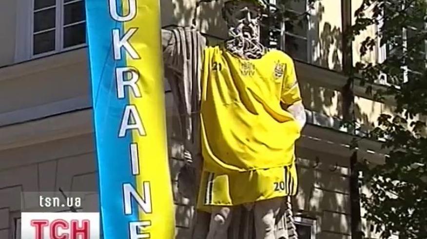 Фигуры фонтанов Нептуна, Дианы, Амфитриты и Адониса, установленные на площади Рынок во Львове, одели в спортивную форму сборной Украины по футболу.