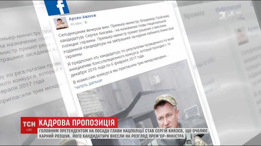 До сих пор финалистов конкурса было трое. И вот глава МВД определился с претендентом на должность главы Национальной полиции Украины. Арсен Аваков вечером внес на рассмотрение премьер-министра кандидатуру Сергея Князева. Сейчас этот генерал возглавляет департамент уголовного розыска. Представленную кандидатуру глава правительства внесет на рассмотрение своего кабинета, вероятно, уже сегодня.