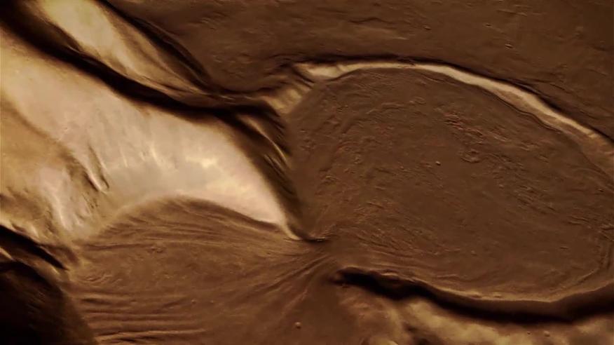 Трехмерный ландшафт смоделирован на основе реальных данных с борта «Марс-экспресса». Примечательно, что он повторяет марсианский рельеф с рекордной точностью.