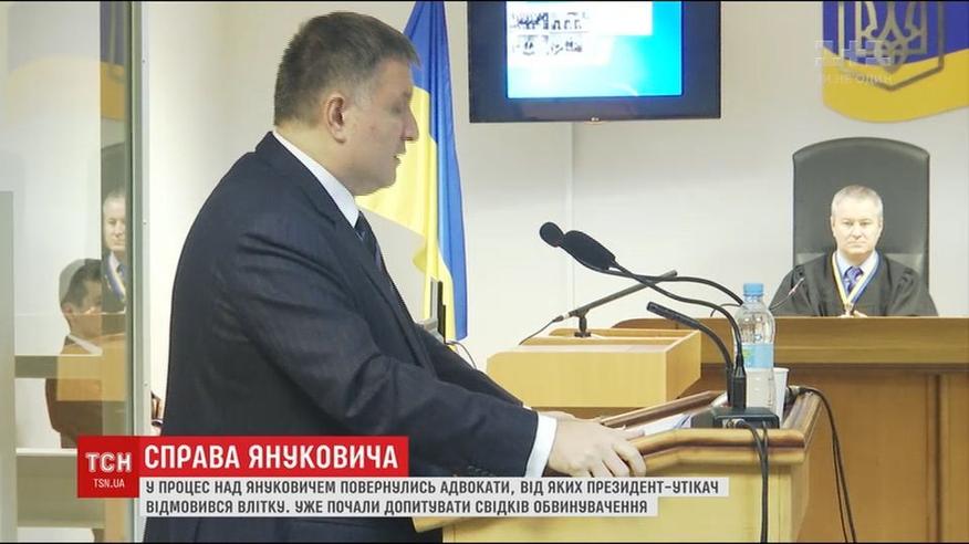 Виктор Янукович вернул в судебный процесс по его государственной измене своих частных адвокатов. Тех самых, от которых он же отказался еще летом. После обеда в суде появились и первые свидетели обвинения - Арсений Яценюк и Арсен Аваков.