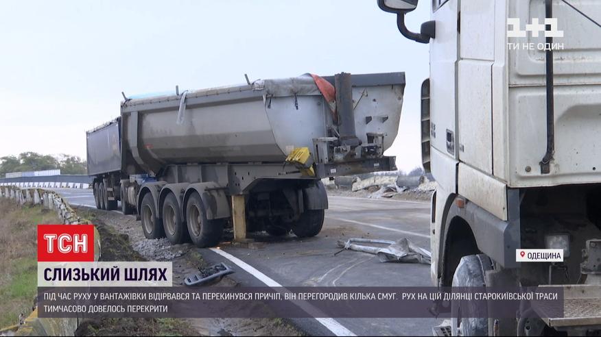 Авария из-за гололеда: неподалеку Одессы прицеп грузовика оторвался на ходу