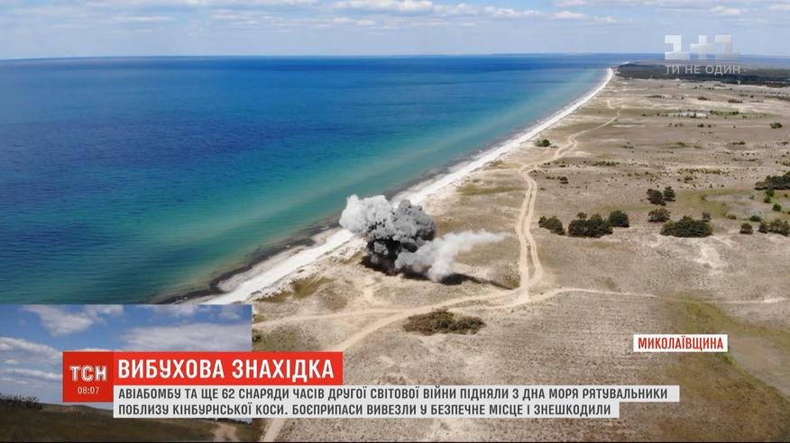 Авиабомбу и более полсотни снарядов подняли спасатели со дна моря возле Кинбурнской косы в Николаевской области. Все боеприпасы - времен Второй мировой войны. Спасатели две недели обследовали акваторию Черного моря. Нашли 62 снаряды разных калибров и фугасная авиабомба. На этом участке под Очаковом во времена Второй мировой войны велись ожесточенные бои.