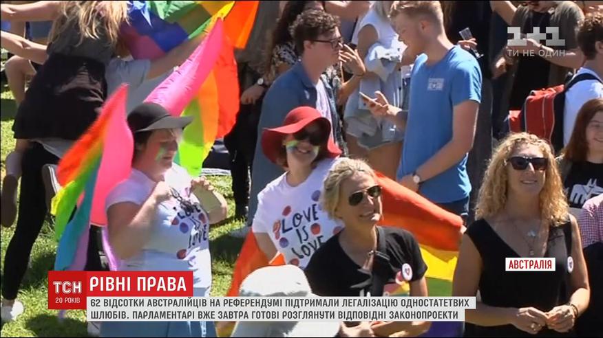 В Сиднее на улицах - массовые гуляния. Опрос проводился по почте. В нем приняло участие 80% избирателей. За официальное признание гей-браков высказались почти 62% респондентов. В парламенте уже заявили, что долго оттягивать с узакониванием однополых браков не будут.