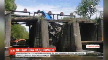 Автомобильный мост обрушился в Тернопольской области. На остатках переправы, возведенной еще в советское время на деревянной дамбе в селе Вертелка, повис грузовик. Кузов с 8 тоннами песка провалился, но передними колесами машина зацепилась за мост, и спасло от падения в реку.