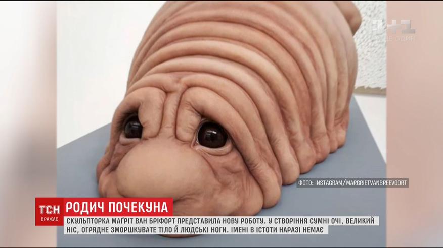 Нидерландская скульптор Магрит ван Брифорт, автор любимца соцсетей "Ждуна", представила свою новую работу. В создание, которое первыми увидели посетители выставки в Гааге - печальные глаза, большой нос, грузное морщинистое тело. Имени существу пока не придумали.