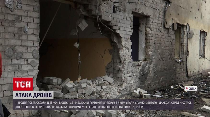11 человек пострадали этой ночью в Одессе. Это жители общежития, рядом с которым упали обломки сбитого "Шахеда". Среди них трое детей, они в больнице с последствиями баротравмы. Повреждены 11 гражданских сооружений. Ночью оккупанты направили на юг Украины более 40 ударных беспилотников. Большинство из них летели в Одесскую область. Воздушная тревога там продолжалась почти 7 часов. О последствиях расскажет журналистка ТСН Елена Черняева.