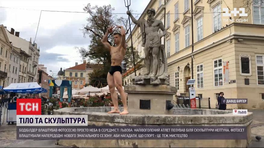 Во Львове полуобнаженный атлет позировал возле скульптуры Нептуна - древнеримского бога морей, который символизирует силу и величие. Фотосет устроили накануне нового соревновательного сезона, чтобы напомнить - спорт — это тоже искусство. В культуризме, говорят, оценивают пропорции, кондиции и позирования. А то же самое, говорят, присутствует во многих художественных произведениях. Позировал в центре и собирал захватывающие взгляды прохожих Давид Биргер - прошлогодний чемпион Украины.