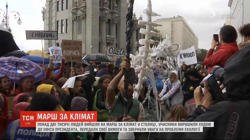 Участники марша из 20 городов Украины собрались на Михайловской площади и двинулись к Офису президента. Колонна растянулась более чем километр. Ради шествия правоохранители перекрыли улицы в центре города. Под стены Офиса президента участники акции принесли огромного динозавра, сделанного из пластиковых бутылок, внутренности которого были наполнены теми же бутылками и полиэтиленом.