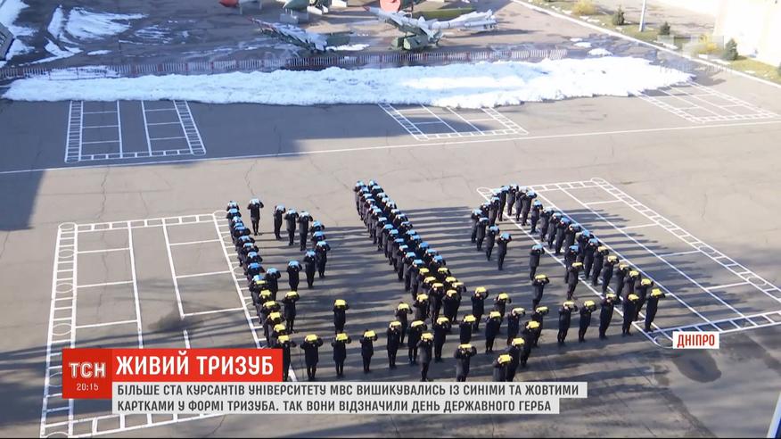 В Днепре ко Дню Государственного Герба образовали живой трезуб. Именно 28 лет назад государственный символ утвердила Верховная Рада. Более ста курсантов университета МВД под открытым небом выстроились с синими и желтыми карточками в форме герба. Говорят, что прежде всего хотели привлечь внимание ко Дню трезубца.