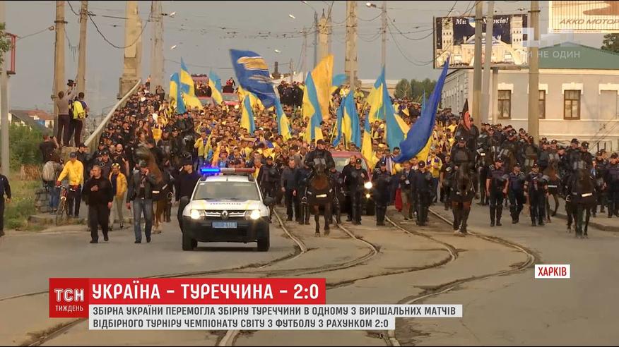 Сборная Украины победила сборную Турции в одном из решающих матчей отборочного турнира Чемпионата мира со счетом 2:0. После матча возле стадиона царило невероятное настроение - фаны не сдерживали эмоций. Многолюдная походка болельщиков заполонила улицы Харькова.