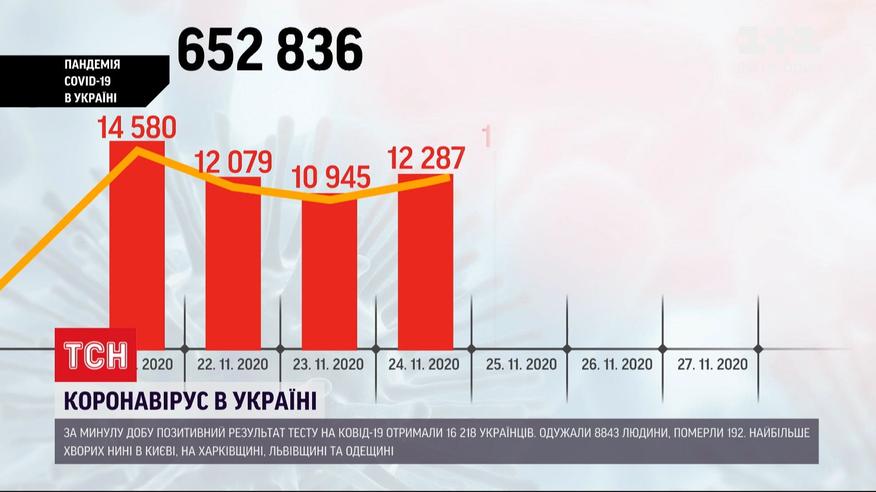 На тысячу больше, чем вчера. За прошедшие сутки в Украине - 16 218 положительных тестов на коронавирус. Больше всего новых случаев в Днепропетровской области - почти 1800. Далее следуют столица и область, Запорожье и Одесская область. Умерло за сутки 192 пациента, выздоровели почти 9 тысяч. Больше о коронавирусе в Украине
