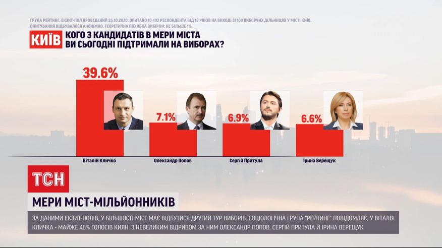 Социологическая группа "Рейтинг" обнародовала экзит-пол, который показывает, как проголосовали избиратели за главу города в столице. Больше всего шансов занять кресло мэра имеет действующий Виталий Кличко. С существенным разрывом он набрал почти 48%. Ну а следующая тройка, с учетом погрешности, идет почти с одинаковыми результатами - Александр Попов, Сергей Притула и Ирина Верещук набирают не более 8% голосов.