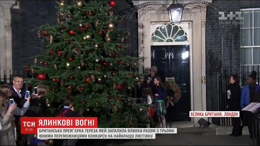 Помогали главы правительства - три девочки. Все они - победительницы конкурса на лучший дизайн правительственной открытки. Премьер поблагодарила детей за помощь в разработке приветствие, которое она отправит тысячам людей. Когда гирлянда на елке засияла, Мэй вместе с детьми спела рождественскую колядку.