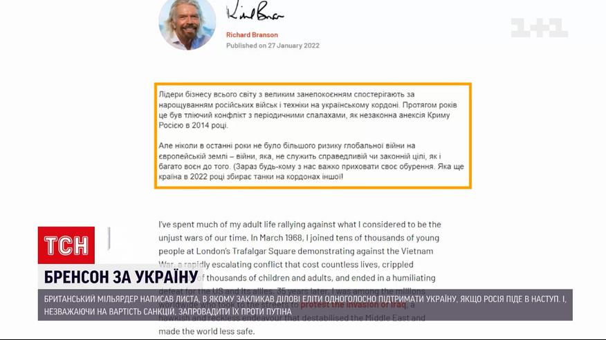 Британский миллиардер Ричард Бренсон написал эмоциональное письмо в поддержку Украины, в котором предупредил: в случае нападения Путин никогда не выиграет, а для россиян последствия станут такими же катастрофическими, как после войны в Афганистане. Публичное обращение обнародовано на сайте владельца "Вирджин Групп". Миллиардер призывает деловую элиту поддержать суверенитет Украины, даже если за это придется заплатить.