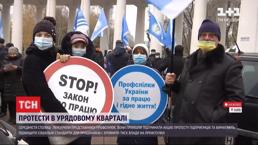 Центр города столицы снова в осаде. На этот раз улицу Грушевского перекрыли представители профсоюзов. Они пришли поддержать акцию протеста предпринимателей и требуют повысить социальные стандарты для работников и остановить давление власти на профсоюзы. Подробности - в прямом включении.