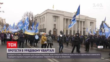 Центр города столицы снова в осаде. На этот раз улицу Грушевского перекрыли представители профсоюзов. Они пришли поддержать акцию протеста предпринимателей и требуют прекратить давление власти на профсоюзы. На прошлой неделе Печерский суд Киева арестовал ряд объектов недвижимости, в том числе Октябрьский дворец и Дом профсоюзов, принадлежащих федерации. Чиновников профсоюзов подозревают в присвоении государственной недвижимости в особо крупных размерах.