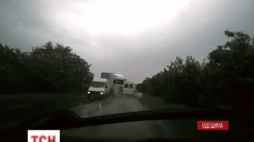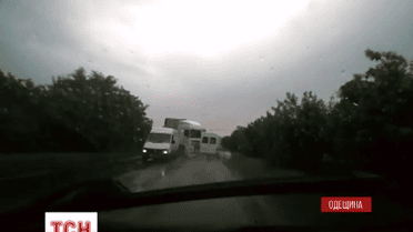 Водитель фуры, которая двигалась по трассе Рени-Одесса во время дождя, не справился с управлением и многотонную махину выбросило на встречную полосу. Этот момент снял видеорегистратор в одной из машин. Фура ударила микроавтобус в боковую часть. Маршрутка перевернулась, но никто не пострадал.