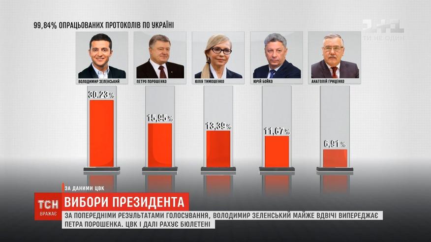 За Владимира Зеленского в первом туре президентских выборов проголосовали более 30% избирателей. За Петре Порошенко - около 16%. И именно эти двое будут бороться за главный пост страны во втором туре 21 апреля.