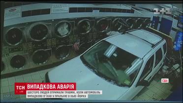 На видео с камер наблюдения видно, как машина сначала едет медленно, а потом набирает скорость и врезается в витрину прачечной, где были люди. Во время аварии пострадали шесть человек, среди которых и водитель машины.