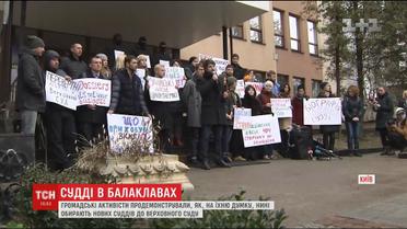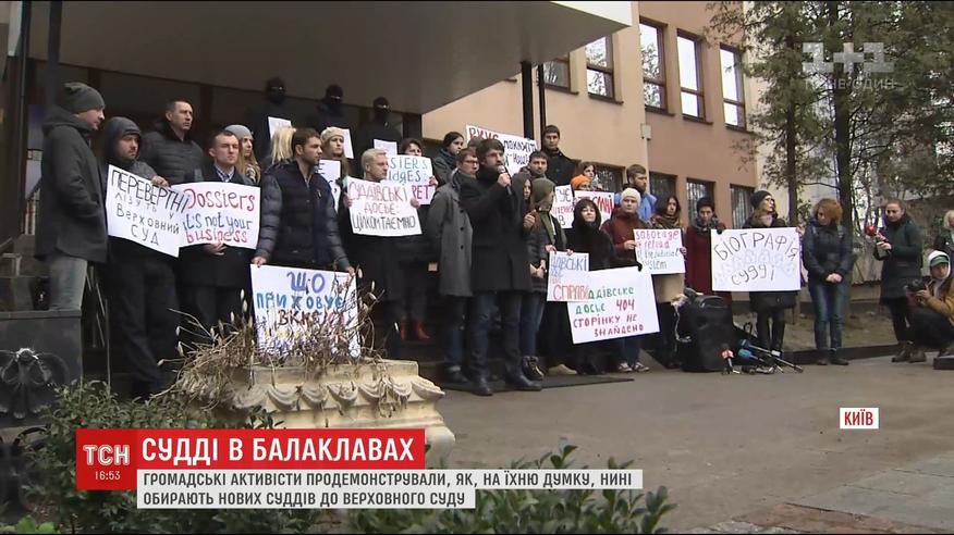 В судейских мантиях с балаклавой на голове. Так, по мнению общественных активистов, сейчас выбирают новых судей в Верховный суд. Участники перфоменса заявляют, досье кандидатов намеренно скрывают от общественности. Закон требует опубликовать данные о претендентах на сайте высшей квалификационной комиссии, однако конкурс уже завершается, а досье до сих пор засекречены.