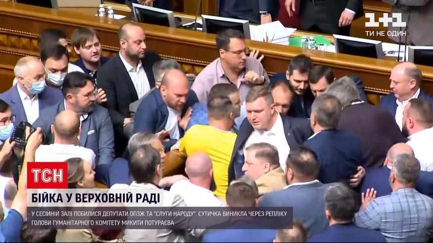 Драка в парламенте. В сессионном зале подрались депутаты "ОПЗЖ" и "Слуги народа". Во фракции Медведчука обиделись на реплику председателя гуманитарного комитета Никиты Потураева. Обиженные нардепы окружили трибуну, на защиту Потураева подтянулись депутаты монобольшенства. После перерыва, объявленного спикером, Потураев извинился перед "ОПЗЖ".