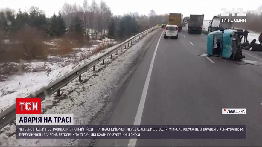 Авария на скользкой дороге. На трассе "Киев-Чоп" вблизи Олесского замка 50-летний водитель микробуса не справился с управлением и врезался в отбойник. От удара авто перевернулось и зацепило легковушку и тягач, которые проезжали в это время по встречной полосе. Пострадали четыре пассажира микроавтобуса, их госпитализировали.