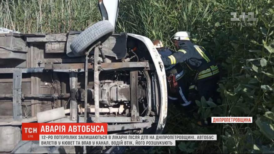 Двенадцать пострадавших остаются в больнице после ДТП в Каменском Днепропетровской области. Накануне на междугородной трассе рейсовый автобус вылетел в кювет и перевернулся, в медучреждение госпитализированы полтора десятка человек. Одна из пассажирок в очень тяжелом состоянии. Водитель скрылся с места аварии, его разыскивают. Подробности - в сюжете.