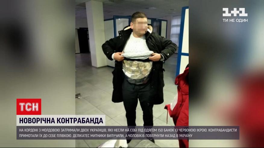 Пояс из более чем 150 банок с красной икрой. На границе с Молдовой задержали контрабандистов. Деликатес двое украинцев несли прямо на себе под одеждой. Банки с икрой они примотали к туловищу пленкой. Говорят, везли деликатес дедушке в Молдову. Икру таможенники изъяли, а мужчин вернули обратно в Украину.