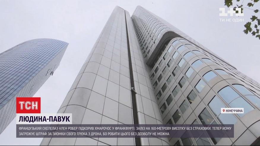 Залез на небоскреб без страховки, в блестящем костюме и ковбойских сапогах. Французский скалолаз Ален Робер, более известный как "человек-паук", за полчаса покорил главный офис немецкой железной дороги - "Дойче бана" - во Франкфурте. Это высотка более 160 метров высотой. Пока царапался, внизу собрались медики и спасатели, а полицейские оцепили квартал.