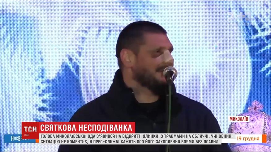 Зрителей поразил ни дизайн новогоднего дерева, и не праздничное шоу, а лицо Алексея Савченко. Причину такого внешнего вида чиновник комментировать не стал. Его окружение сначала рассказывал об аварии, в которую якобы попал Савченко. А потом пресс-служба выдвинула другую версию: шеф увлекается боями без правил.