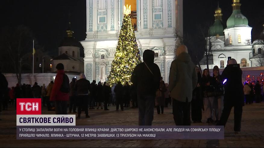 В столице зажгли огни на главной елке страны. Действо широко не анонсировали, но людей на Софийскую площадь пришло немало. Елка - искусственная, 12 метров высотой, с трезубцем на макушке. Нынешняя новогодняя тематика - "Храбрые сердца". Поэтому дерево украсили игрушками в форме синих и желтых сердец. Детали - в ТСН.