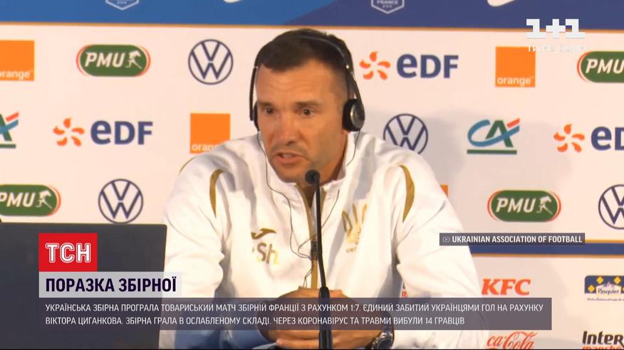 Стечение обстоятельств: так главный тренер Андрей Шевченко прокомментировал разгром украинской сборной в Париже. Наши проиграли со счетом 1:7. И добавил: на поле вышла фактически молодежная сборная. Перед матчем из-за травм, а еще больше из-за коронавируса команда потеряла в составе 14 игроков, трое из них - вратари. Дошло до того, что перед самой игрой главный тренер украинцев поставил в игру своего 45-летнего ассистента - голкипера Александра Шовковского, который завершил карьеру более трех лет назад. Впрочем, выходить на поле в Париже ему не пришлось. Такое количество мячей в одном матче национальная команда не пропускала за всю свою историю. Подробнее - смотрите далее.