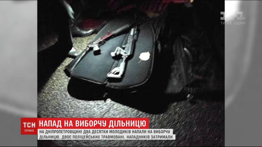 В селе Майское накануне проходили выборы в объединенной территориальной общины. По данным полиции, вечером на избирательный участок ворвались два десятка человек в камуфляже. Они стали крушить имущество, бросили дымовые шашки и хотели залить зеленкой урны с бюллетенями. Копы, дежурившие на участке, бросились защищать имущество. Нападавшие бросались на них с топором и произвели выстрелы. Двое полицейский получили травмы. На Днепропетровщине объявили план "Перехват" и задержали семь автомобилей. В них обнаружили пистолеты, автоматы, арматуру и бить.