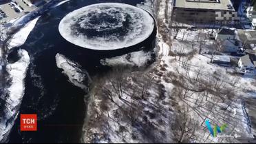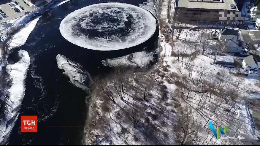 В американском штате Мэн на реке сформировалось идеальный круг льда. Его ширина превышает 90 метров. Ученые говорят, явление редкое, впрочем, общеизвестное. Такие круги формируются, когда снег или грязь замерзают в водном водовороте.
