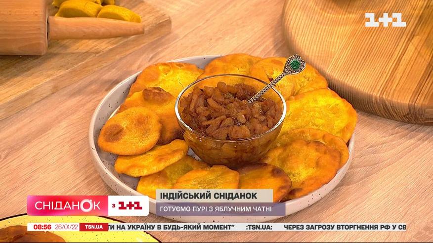 Поскольку сегодня день Республики Индия, то и блюдо у нас будет традиционным. Научим вас сейчас готовить пури – это индийские жареные лепешки из пресного теста. Индийские пури: пшеничная мука – 1 ст., теплая вода – 0,5 ст., соль – 0,5 ч. л., сливочное масло – 2 ч. л., куркума - пучка, масло – 1 ст. Также изюминкой индийской кухни считают чатни – густой соус, который подают в маленьких тарелочках к основному блюду. Яблочный чатни: яблоки – 400 г, лук – 1/2 шт., изюм - 70 г, имбирь – 25 г, сахар – 50 г, яблочный уксус – 50 мл, корица – 1/3 ч. л., сливочное масло – 25 г, гвоздика – 2-3 шт., кари – по вкусу.