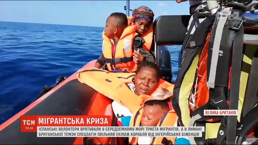 Беженцы бежали из Ливии в европейские страны. Мигрантов на резиновых лодках доставили на корабль организации. Сейчас ищут для них приют. Среди спасенных - три беременных женщины, младенец и семилетний ребенок. А вот в лимане британской Темзы вооруженный спецотряд спасал от беженцев экипаж корабля, направлявшегося из Нигерии.