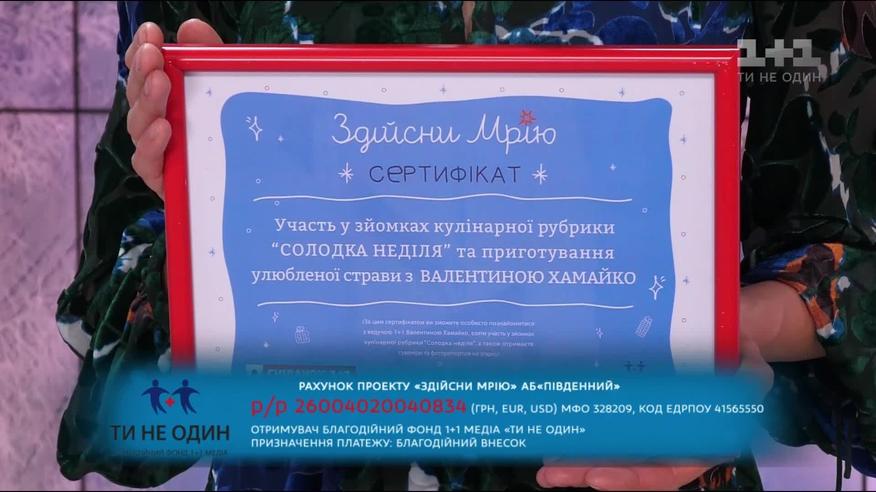 Ведущая "Сніданка. Выходной" Валентина Хамайко представляет лот - участие в съемке рубрики "Сладкое воскресенье". Стартовая цена - 2000 гривен.