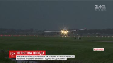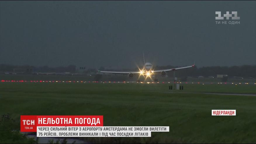 Из-за сильных ветров, от которых страдает столица Голландии, отменили 75 авиарейсов. Скорость ветра в Нидерландах достигала 120 километров в час. Слетать в таких условиях можно было не из всех полос аэродрома, поэтому некоторые вылеты отменили.