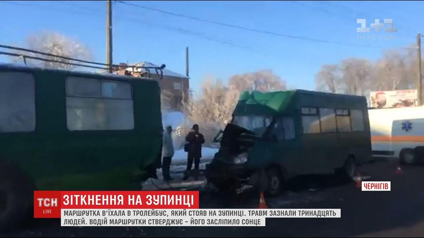 Из-за ослепления водителя в Чернигове маршрутка врезалась в троллейбус, есть пострадавшие