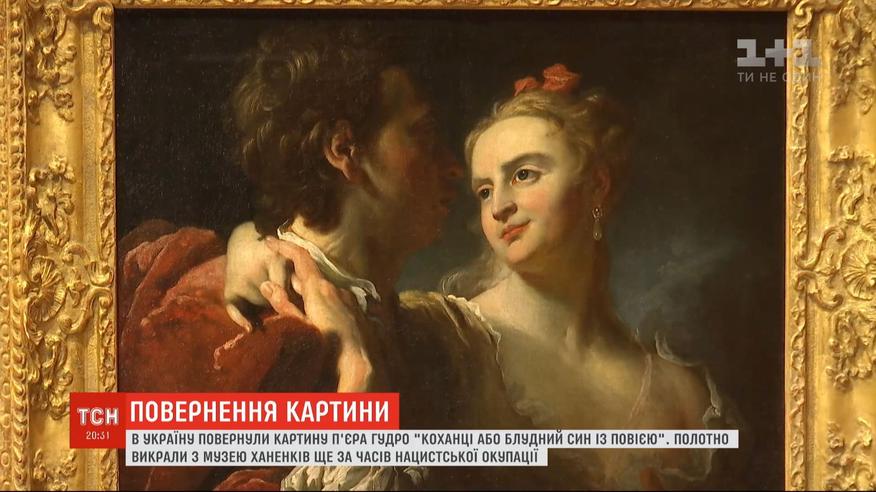 Картину французского художника Пьера Гудро вернули в столичный музей Ханенко. В прошлом веке полотно "Блудный сын" музею завещал коллекционер Василий Щавинский. Во времена нацистской оккупации картину похитили и вывезли в Германию. Только в 2013 году украинская музейщица случайно увидела ее на нью-йоркском аукционе. Понадобилось 7 лет экспертиз, чтобы доказать украинскую принадлежность полотна.