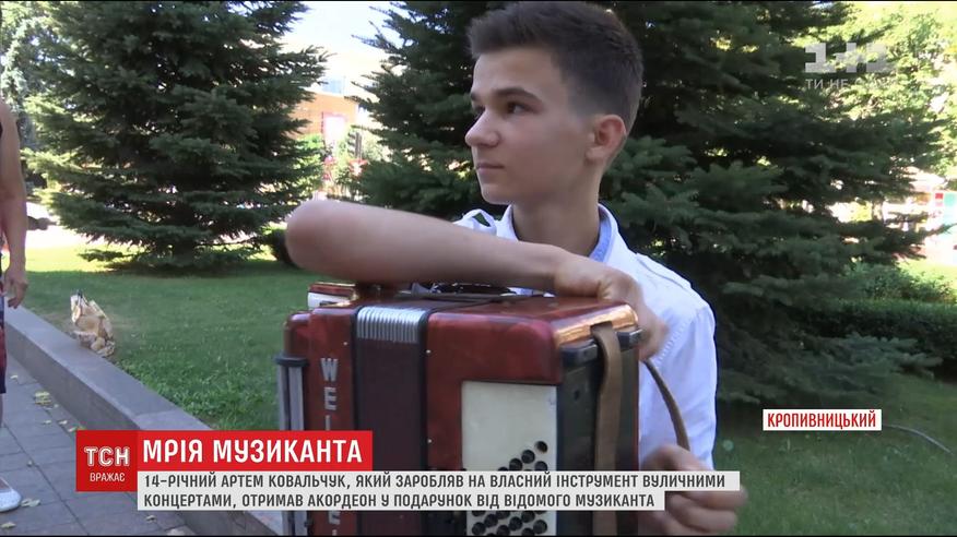 Мальчик все лето играл на улицах города, чтобы накопить на инструмент, потому что не на чем упражняться. История парня дошла до известного украинского джазмена Майка Кауфмана-Портникова. Музыкант решил передать Артему семейную реликвию - инструмент, принадлежавший еще его деду.