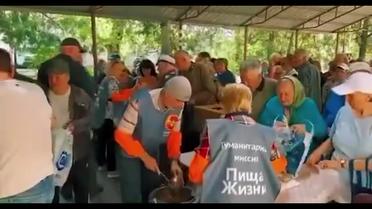 Россия не принесла Украине ничего, кроме боли, смерти и нищеты. Этот факт ярко доказывают свежие кадры из оккупированного Северодонецка. Так, людям раздают еду на фоне здания с выбитыми окнами.
