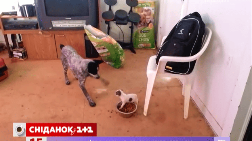 Хозяева насыпали собакам обед. Вот только меньший не захотел делиться. Начал бросаться на большего, а потом вообще залез в тарелку лапами.