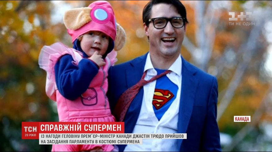 Джастин Трюдо в роль употреблялся постепенно - на встрече с украинским коллегой Владимиром Гройсманом уже был с зализанным волосами, а под белой рубашкой журналисты разглядели голубое трико. Уже после встречи Трюдо дополнил образ большими очками. А когда шел на заседание парламента - расстегнул рубашку и продемонстрировал знак супермена на груди.