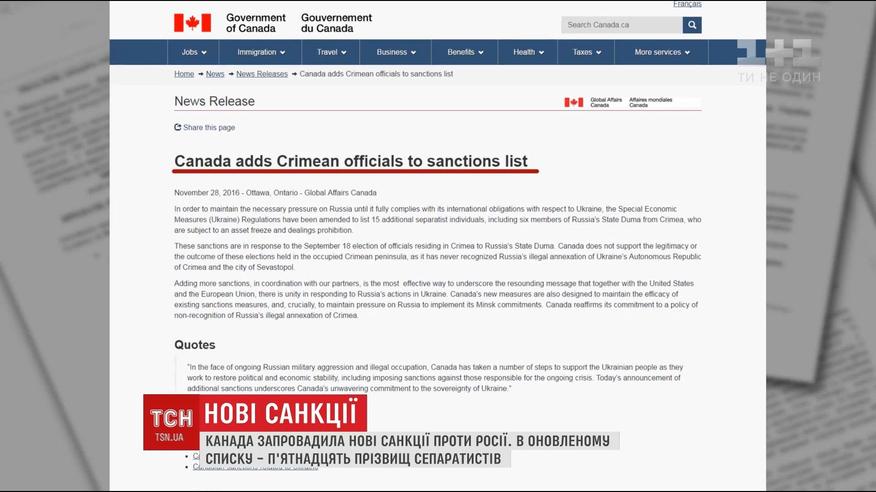 В "черный список" добавили 15 человек, которых официально назвали сепаратистами. Шестеро из них - избранные в Госдуму от оккупированного полуострова. В Канаде отметили, что там не признают русскую аннексию украинского Крыма и не могут назвать российские выборы, проведенные на полуострове, легитимными.