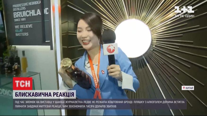 Мгновенная реакция. Китайская журналистка в прямом включении чуть не разбила дорогой бренди. Девушка как раз находилась на съемках международной выставки в Шанхае. И случайно спиной задела бутылку с алкоголем. К счастью, реакция журналистки была молниеносной, и она успели схватить ее одной рукой. Другой она держала микрофон, чему в немалой степени обрадовался персонал выставки. Ведь одна такая бутылка стоит более 600 долларов.