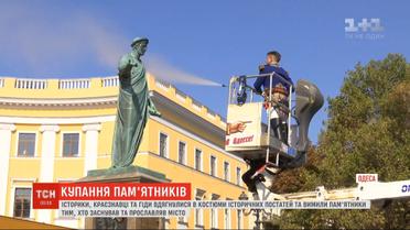 Необычную акцию устроили местные историки, краеведы и экскурсоводы. Они оделись в костюмы исторических фигур 18 века и тщательно вымыли памятники тех, кто строил и прославлял город. Бронзовые статуи мыли с соблюдением всех технологий, чтобы не навредить. Участники мероприятия говорят, что таким образом хотели не только очистить памятники, но и популяризировать историю Одессы.