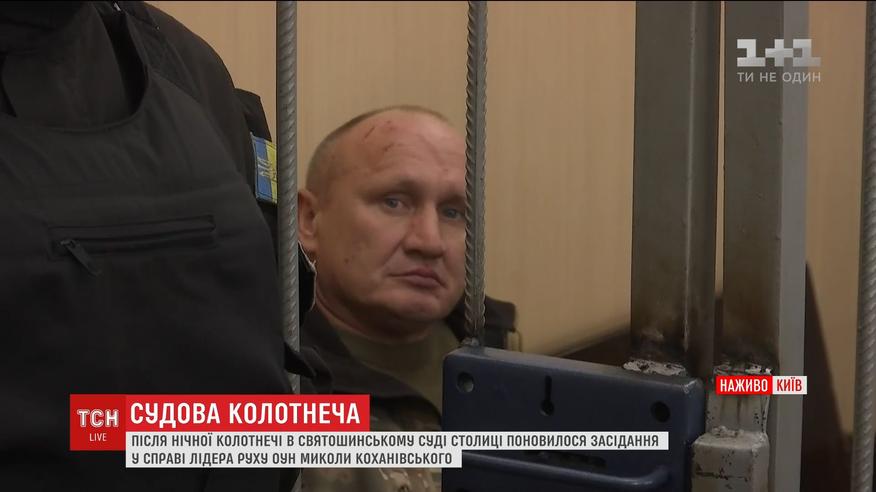 Николая Коханивского привезли из больницы. Теперь ему инкриминируют не только стрельбу из травматического оружия по человеку, но и сегодняшние события в Святошинском суде - барикадирование помещения и сопротивление правоохранителям. Адвокаты просят отвода прокурора и отпустить Коханивского на свободу, потому что, якобы, первое подозрение ему вручали с нарушением.