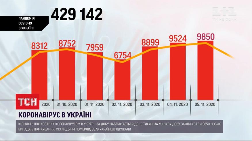 К 10 тысячам приближается количество инфицированных коронавирусом в Украине за сутки. Есть 9850 новых случаев. Это статистика Минздрава. Ежесуточный прирост увеличивается с каждым днем. Накануне количество больных впервые перевалило за 9 тысяч. А сегодня у нас уже более чем на 300 больше. Увеличивается и количество умерших от осложнений, вызванных коронавирусом, - 193 человека не смогли преодолеть недуг. Впрочем есть и обнадеживающая статистика - количество выздоровевших тоже стремительно увеличивается, за минувшие сутки имеем 8378 украинцев.
