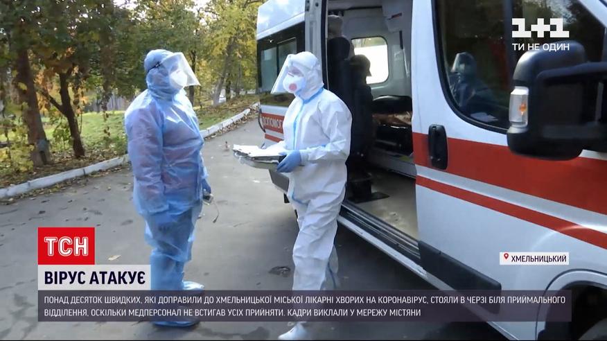 Кареты скорой в очереди. В сеть попали кадры приемного отделения Хмельницкой городской больницы. Более десятка скорых ждут перед больницей, и в каждой из машин - больной на COVID-19. Медицинский персонал просто не успевает всех принять. А мест в больницах Хмельницкого почти не осталось.